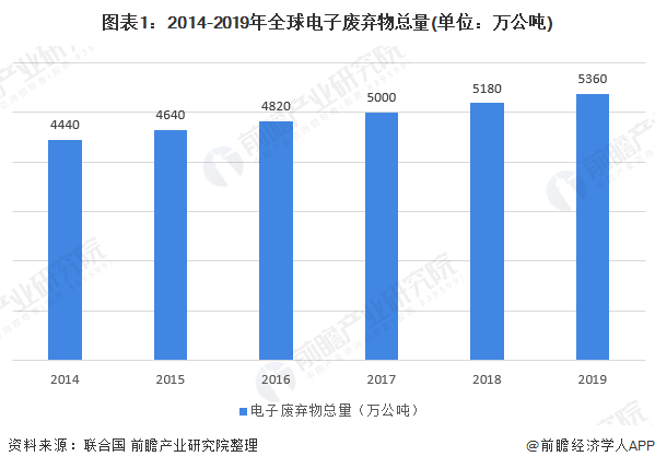 2014-2019年,全球電子廢棄物總量不斷增加。《2020年全球電子廢棄物監測》報告顯示,2019年全球產生的電子廢棄物(帶電池或插頭的廢棄產品)總量達到了創紀錄的5360萬公噸。