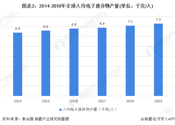 從人均電子廢棄物產量來看,2014-2019年全球人均電子廢棄物產量逐年增加,2019年達到7.3千克/人。