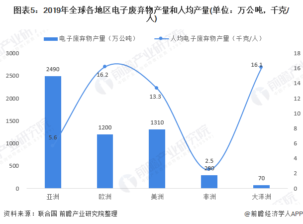 2019年,亞洲產生的電子廢棄物數量最多,約為2490萬公噸,其次是美洲(1310萬公噸)和歐洲(1200萬公噸),而非洲和大洋洲分別產生了290萬公噸和70萬公噸。