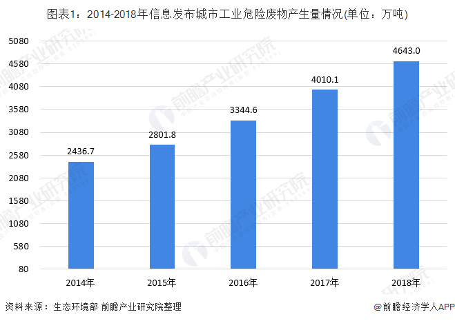 根據(jù)生態(tài)環(huán)境部發(fā)布的《全國大、中城市固體廢物污染環(huán)境防治年報》數(shù)據(jù)顯示,2014-2018年信息發(fā)布城市工業(yè)危險廢物產(chǎn)生量逐年上升。2018年,200個大、中城市工業(yè)危險廢物產(chǎn)生量達4643.0萬噸。
